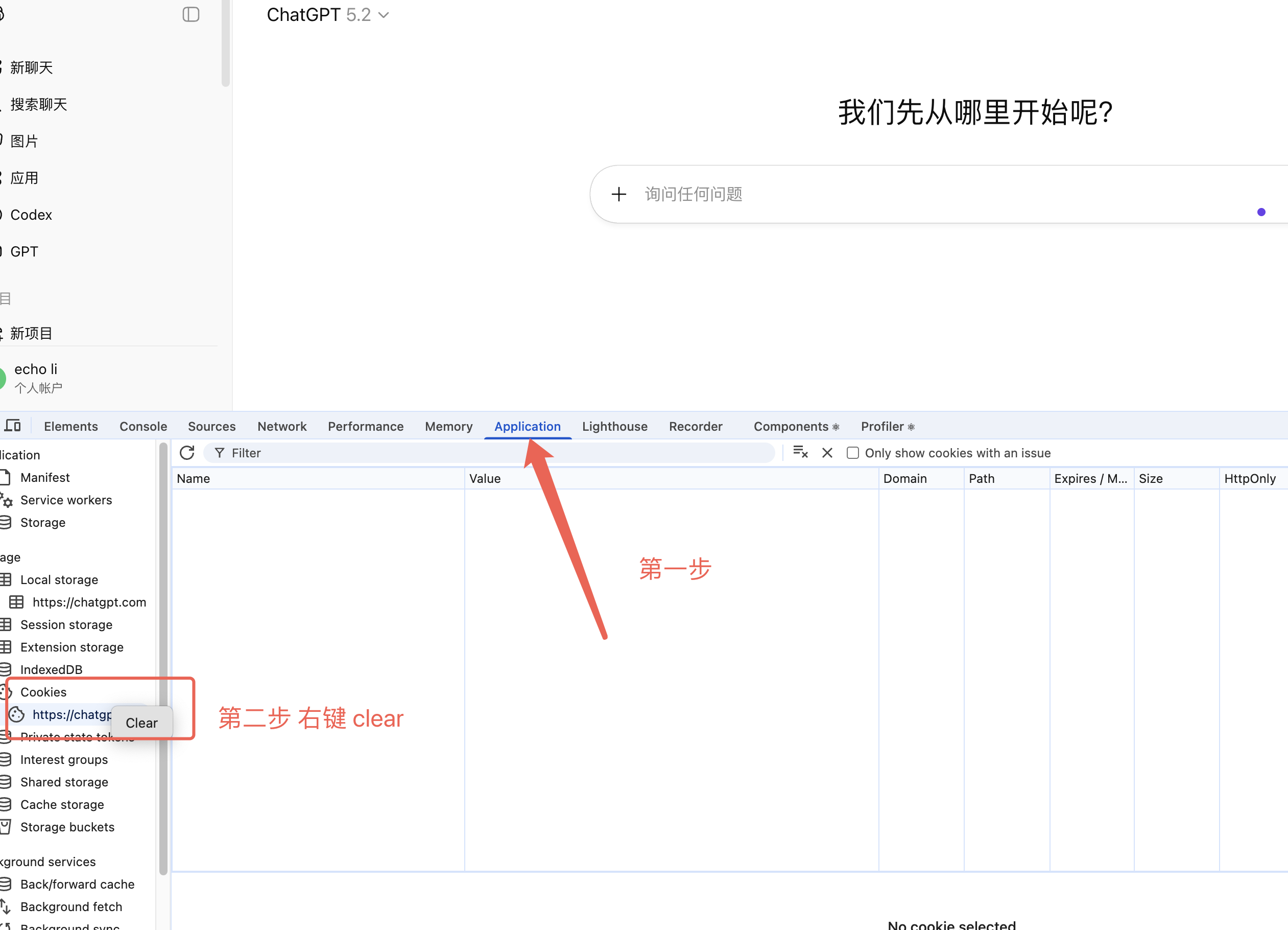 - F12 打开浏览器(最好是 chrome、firefox)清除 chatgpt.com 的 cookie 然后重新登录