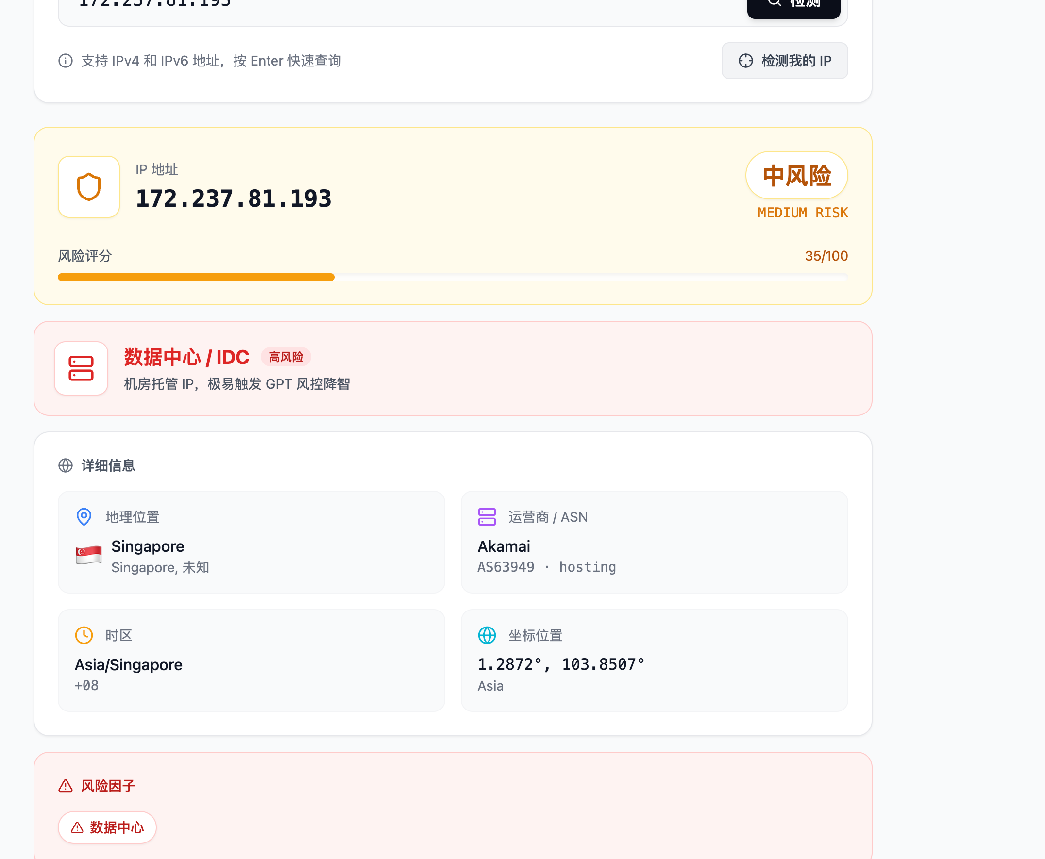 AI 的视角: "这是一个商业机房,正常人谁会住在机房里上网?这大概率是爬虫、机器人或者代理跳板。" -> 标记为【高风险】。